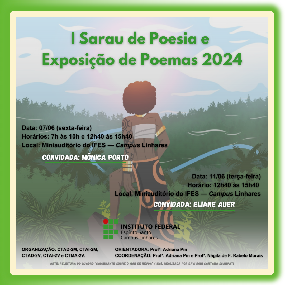 Neste evento, exploraremos a rica tradição poética do Romantismo Brasileiro, abordando a estética e a contextualização histórica dos poemas líricos e épicos produzidos pelas três gerações de poetas desse movimento literário, estabelecendo um diálogo entre as temáticas dos poemas clássicos da Literatura Brasileira com o contexto atual dos estudantes dos segundos anos dos cursos técnicos integrados ao Ensino Médio do Ifes - Campus Linhares (Automação Industrial, Administração e Meio Ambiente), promovendo a leitura, a interpretação e a produção crítica de poemas, com produção de sentidos pelos estudantes.